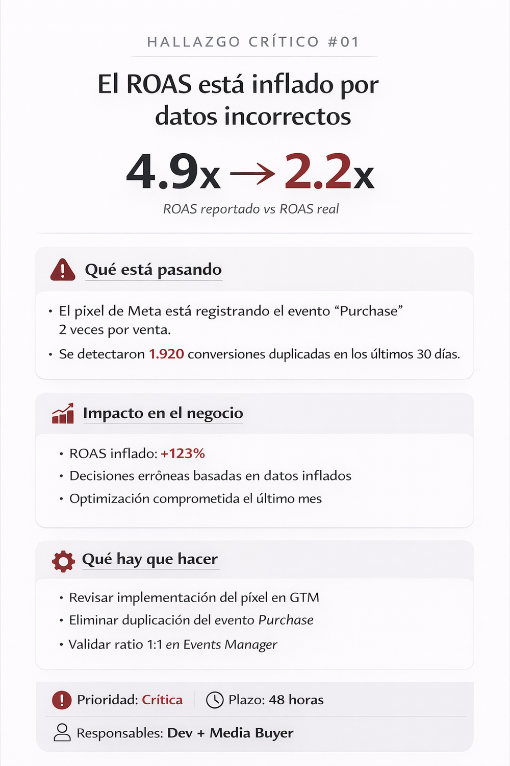 Un informe PDF con hallazgos clasificados por impacto crítico, medio y bajo, más un plan de acción priorizado. Listo para ejecutar por ti o dárselo a quien gestione tus cuentas.